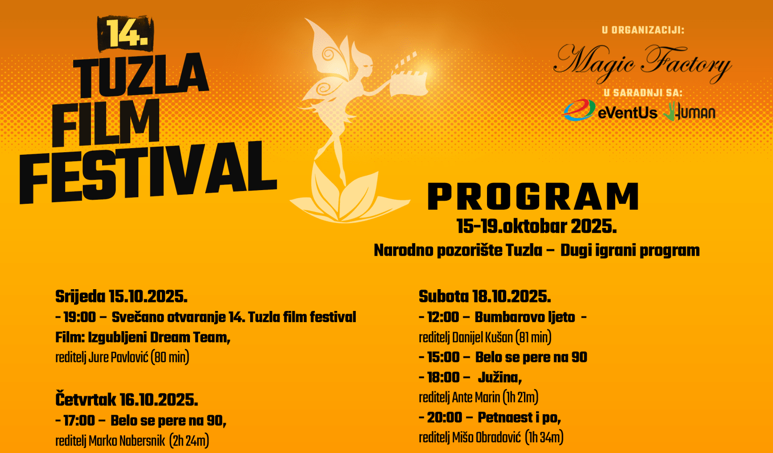 U produkciji organizacija Eventus i Human, festival donosi i bogat prateći program, uključujući radionice pod nazivom „Tuzla – grad filmske kulture“, kafe-podcaste sa poznatim ličnostima, koktele prijatelja i sponzora, te zabavni segment kroz 7. Underground Music Festival, čime Tuzla u oktobru postaje istinski centar filmske i muzičke umjetnosti.