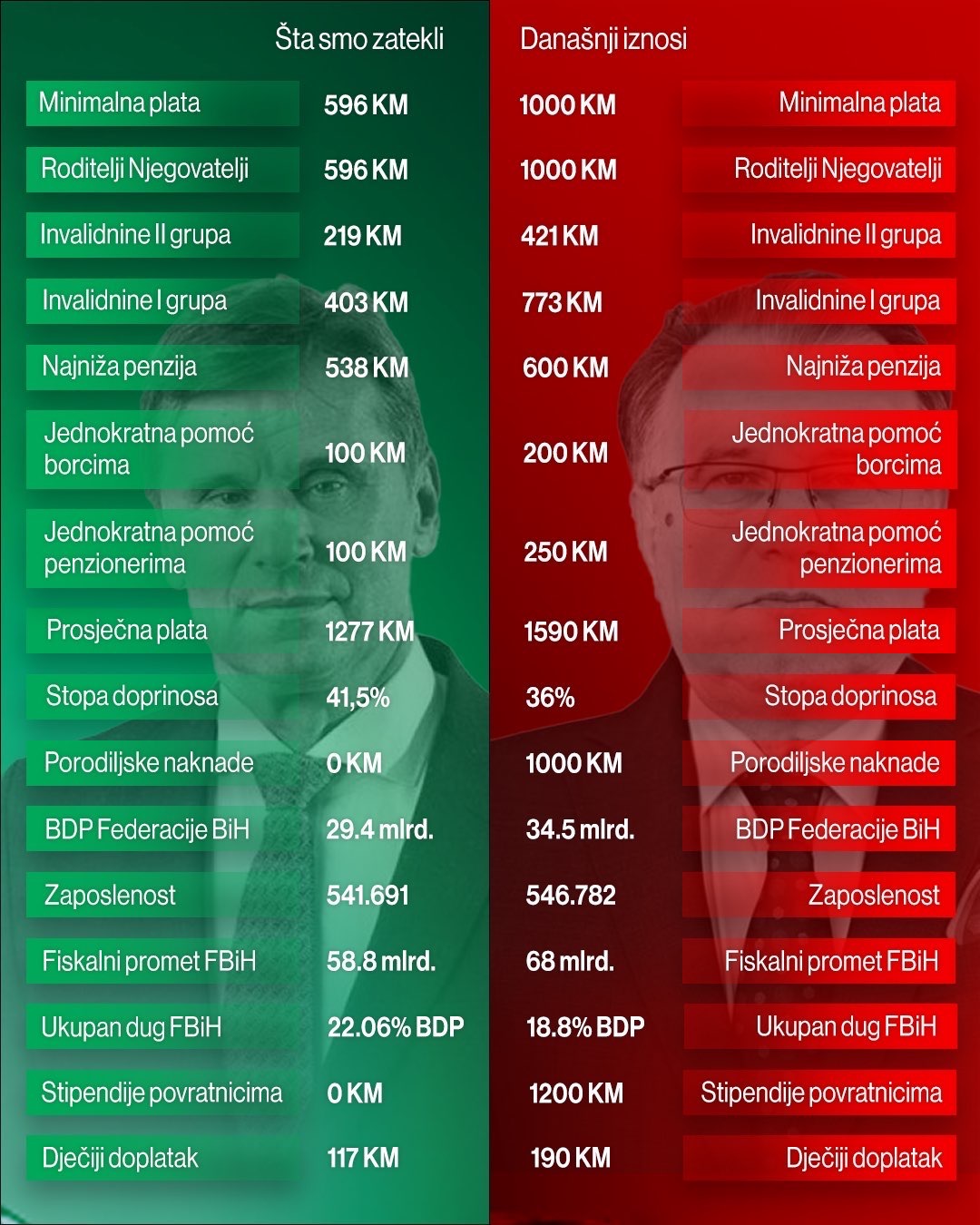 Prema predstavljnim podacima, minimalna plata u Federaciji BiH porasla je sa 596 na 1000 KM, čime je ispravljen višegodišnji stagnirajući trend. Sličan rast zabilježen je i u naknadama za roditelje njegovatelje, dok su invalidnine povećane u obje skupine – za drugu kategoriju sa 219 na 421 KM, a za prvu sa 403 na 773 KM.