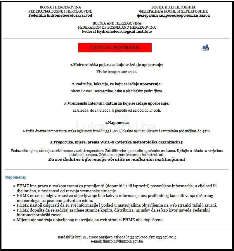 Federalni hidrometeorološki zavod BiH izdao je crveno upozorenje za područje cijele BiH zbog visokih temperatura zraka.