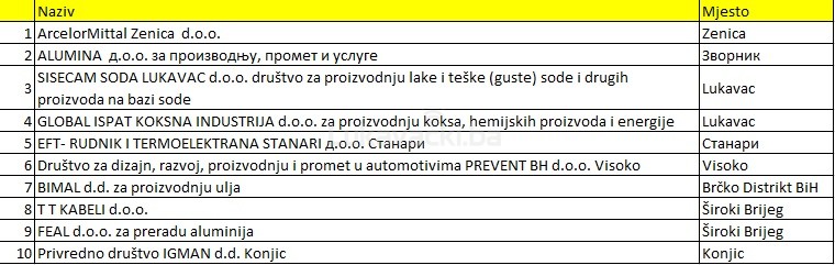 Kada je riječ o izvoznicima, na drugom mjestu je zvornička Alumina, a slijede dvije firme iz Lukavca – Sisecam soda i Global ispat koksna industrija (GIKIL).