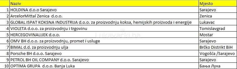 Na petom mjestu je mostarski Hercegovinalijek, kojeg slijede OMV BH, Bimal, te Porsche BH Sarajevo koji je zadužen za prodaju automobila grupacije Volkswagen.