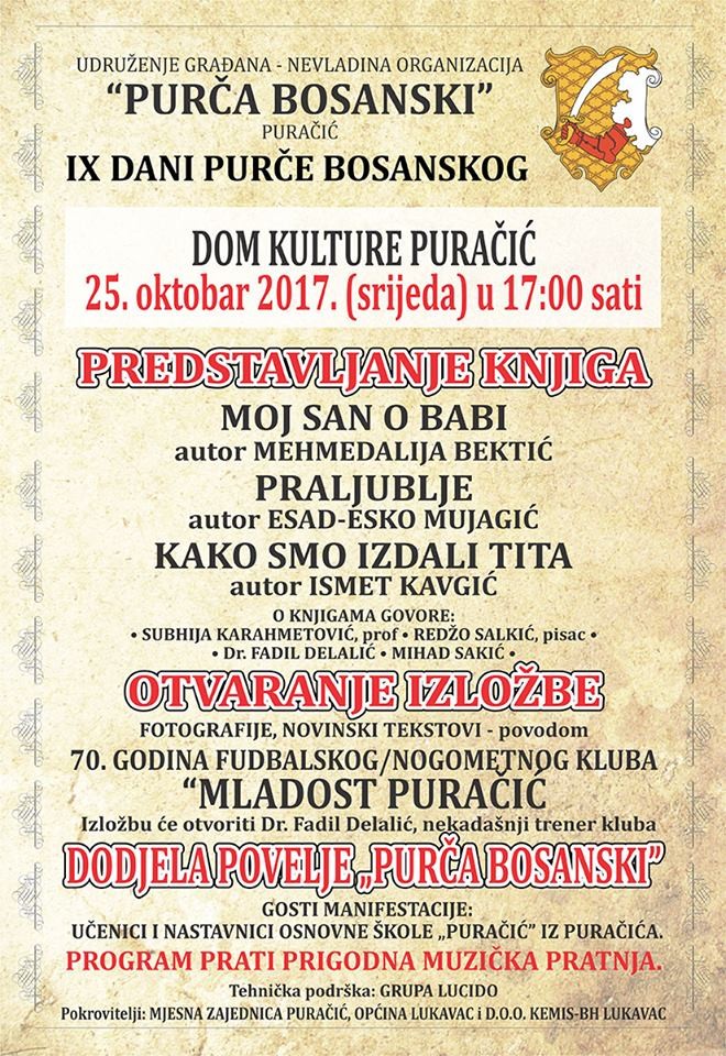Za IX po redu manifestaciju Dani Purče bosanskog planirana je izložba na temu Fotografija, novinski tekstovi povodom 70. godina NK Mladost Puračić, a i ove godine, biće upriličena dodjela povelje Purče bosanskog.