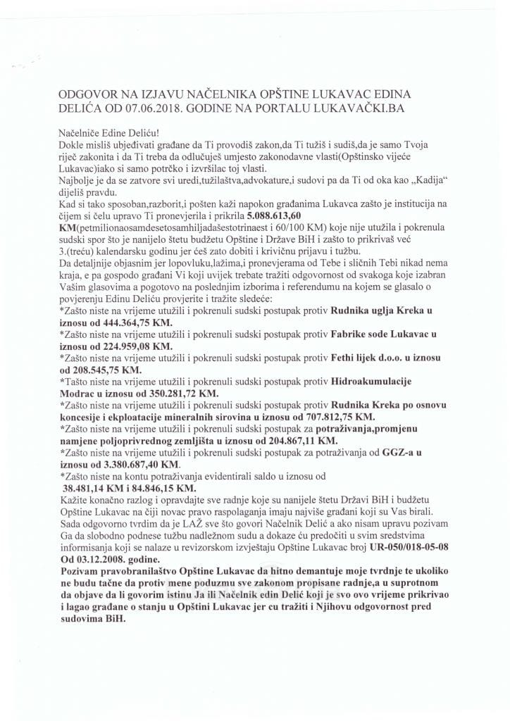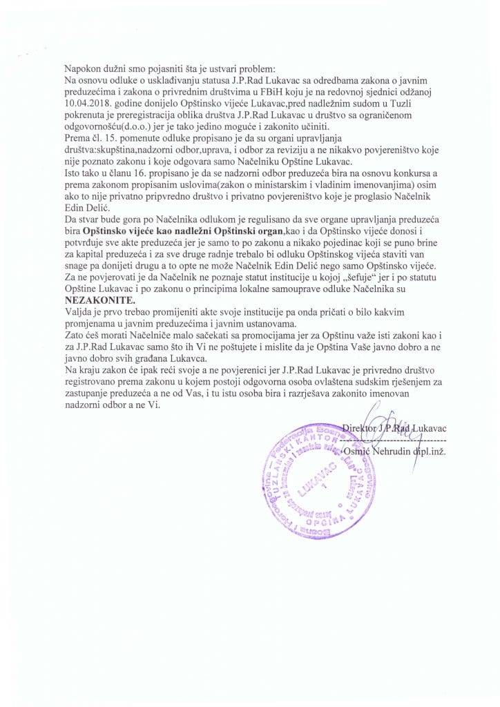 Nakon što je portal Lukavacki.ba u četvrtak popodne objavio tekst koji govori o održavanju Osnivačke skupštine JP Rad Lukavac, imenovanju privremenog Nadzornog odbora, na e-mail adresu portala dostavljen je odgovor Nehrudina Osmića, direktora JP Rad Lukavac na izjave načelnika Općine Lukavac, Edina Delića kojeg smo kontaktirali kao ovlaštenu osobu za imenovanje povjerenika.