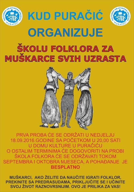 Pruka KUD Puračić jste: Muškarci ako želite da naučite igrati folklor, prekinite sa predrasudama, priključite se i učinite svoj život raznovrsnijim i bogatijim. OVO JE PRAVA PRILIKA ZA VAS!
