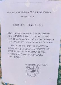 Nova penzionerska/umirovljenička stranka (NPUS) Tuzla organizuje proteste 22. marta s početkom u 12 sati, zahtijevajući od vlasti povećanje penzija i njihovo usklađivanje sa rastom prosječnih plata. Ova informacija stoji na plakatima koji su se pojavili širom Tuzle i pozivaju penzionere i druge građane na okupljanje.